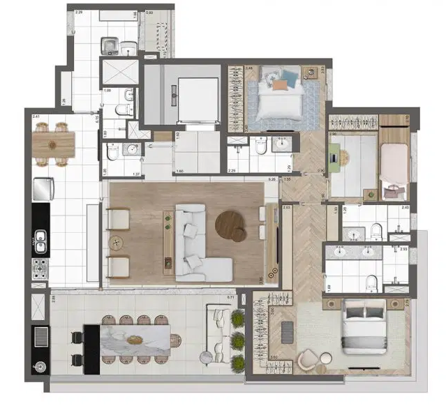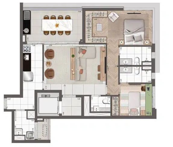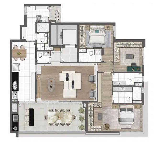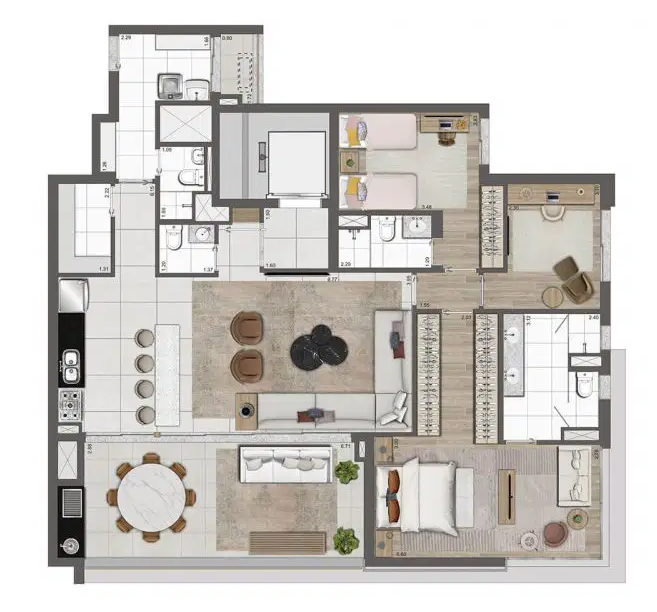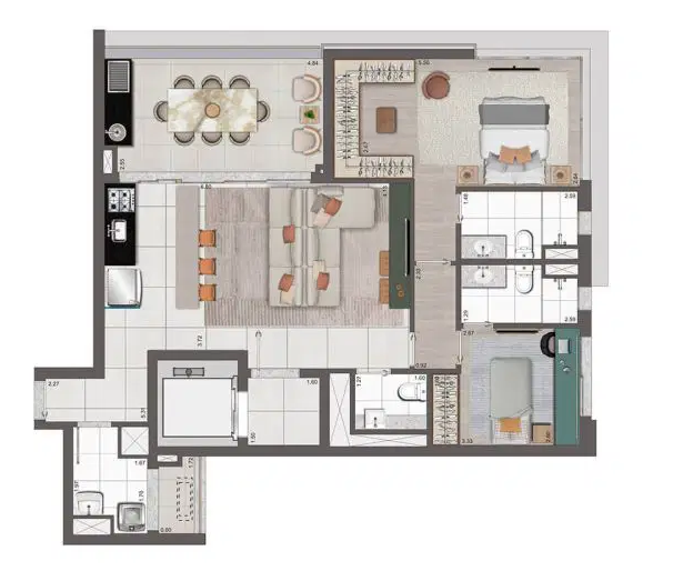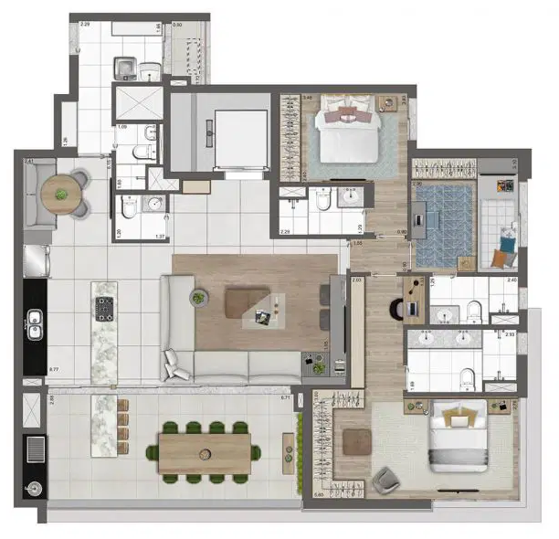 Os apartamentos possuem metragens que variam entre 102 e 192 m², incluindo opções penthouse, com plantas inteligentes, suítes espaçosas e duas vagas determinadas por unidade. O empreendimento foi pensado para oferecer modernidade e bem-estar, com soluções voltadas à tecnologia e à sustentabilidade, como infraestrutura para ar-condicionado, medição individualizada de água e gás, sistema de reuso de água pluvial, gerador para as áreas comuns e pontos de recarga para veículos e bicicletas elétricas. Além disso, cada unidade conta com fechaduras digitais nas portas sociais e de serviço, garantindo ainda mais segurança e praticidade no dia a dia.